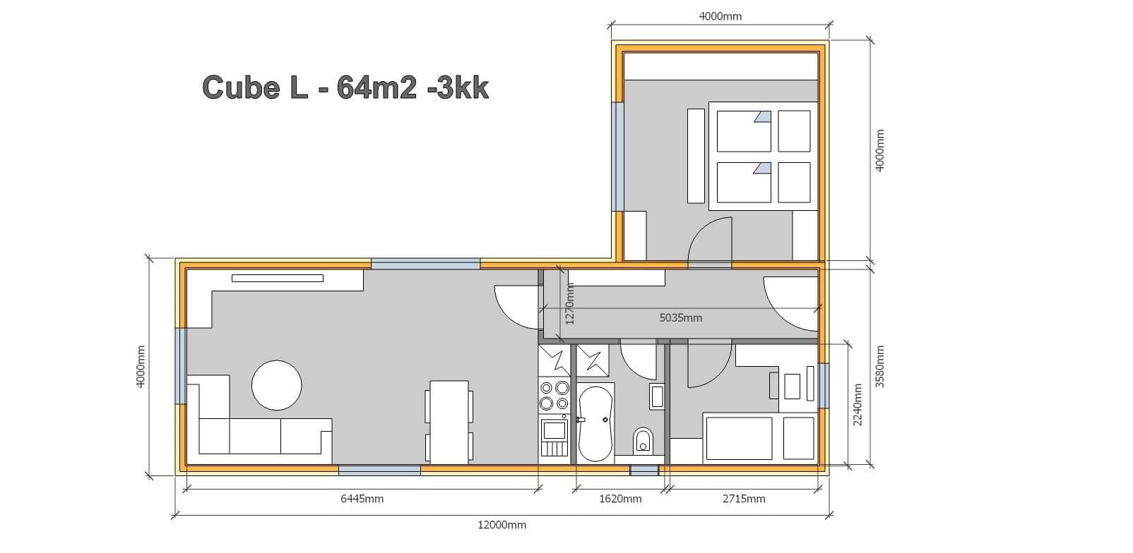 Tento typ modulového domu je vlajkovou lodí naší společnosti, úsporný a zároveň dostatečně velký pro 3- 4 osoby. Domek disponuje zastavěnou plochou 64m2. Je zejména vhodný pro páry s dětmi a lidi v důchodu.Díky panelům s tou nejlepší izolací zaručuje nízkou energetickou náročnost a v kombinaci s tepelným čerpadlem vzduch/vzduch jsou náklady na elektřinu a topení do 800 Kč za měsíc. Dům je zateplený pomocí tvrzené čedičové vaty a sendvičovými PUR panely. Stěna 180mm, podlaha 200mm, Střecha 100mm. Sendvičový panel 100mm odpovídá tloušťce zdiva 100cm. Barvy obkladu a interiérových prvků se řeší po domluvě v průběhu stavby. K naším domkům a plnohodnotnému bydlení Vám bude stačit malý pozemek do 300m2.